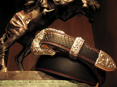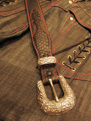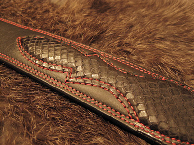 ベルトの本体にはお馴染みのラティーゴレザーを使用し、前後のセミダブルパーツにはマットなバックカットパイソンを使用。