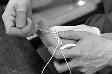蜜蝋を含ませた麻糸を使って職人が1足ずつ手縫いで仕上げる縫製は当初から変わらない技術。