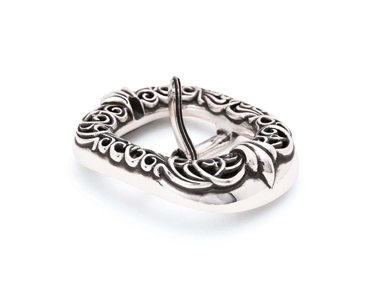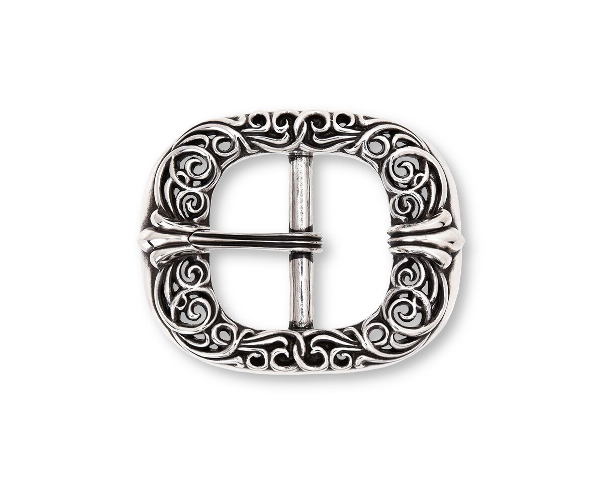 長年培われて来たFUNNYのカービングセンスを生かした繊細で美しいスクロールデザインをSlowならではのフィリグリーによって立体感を醸し、FUNNY FACTORYの象徴であるダブルヨークモチーフを両サイドに大胆にあしらったDouble Yoke Buckle Jr. /ダブルヨークバックルジュニア。 馬具等にも古くから用いられて来たオーセンティックなオーバルスタイルのバックルをルーツにドームのフォルムにこだわり、ベルトを留めるバックルのピンは一見どこにどの様にあるのか首を傾げてしまう程そのダブルヨークモチーフと美しく一体化しています。 これはSlowデザインのバックルを製作する上で最もこだわったギミックパーツであり、FUNNYならではのこだわりを貫いた美意識の高さと精度の高さが伺えます。 また、そういったデザイン性はバックル裏面にも見て取れ、装着時には決して他人に見られる箇所ではないもののベルトを支える中央のバーにはダブルヨークモチーフが施され、それはまるで中世の建造物の支柱のような荘厳さと強靭さを所有する者に与えてくれます。