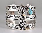 本アイテムは、取り外し可能なペンダントトップ付きブレスレットです。ショーピースと呼ぶに相応しい繊細で複雑な細工はもちろん、ウォーターメイデンの部分がブレスレットから脱着可能かつペンダントとしても使用可能なギミックをほどこす等、近年の作品の中では目を見張るアイデアと斬新なデザインが込められた逸品です。アメリカ原産のキャンデラリア・ターコイズを水滴に見立てる自由な発想など、作品作りにテンプレート(型)を持たないジェイソンならではの、芸術性とホピの魂や文化をアートとして具現化する彼の創造力が実感できる作品と言えます。