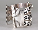 本アイテムは、ホピの大御所アーティスト「Jason Takala(ジェイソン・タカラ)」氏の作品です。代表的デザインとしてMan In The Maze(マン・イン・ザ・メイズ)のオーバーレイがあげられ、中でも8本メイズはジェイソンの真骨頂として、その繊細なカッティング技術が高く評価されています。また、作品作りにテンプレート(型)を持たないジェイソンは、型に囚われない創造性豊かなデザインにより、ホピの魂や文化を宿らせ、ジュエリーという形で表現しています。