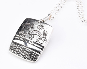 1953年生まれのベテランアーティストである「Norbert Peshlakai(ノルバート・ぺシュラカイ)」 トラディショナルなイメージが強いスタンプワークの技法を、斬新なアイデアとデザインによりコンテンポラリージュエリーに昇華させた唯一の存在。 一見すると奇想天外なアイデアや古代インディアンの壁画や焼き物に描かれるミンバーデザイン(ウサギ、トンボ、魚、鹿など)などのアイキャッチーな部分に注目が集まりますが、其の実、正確無比に打刻されるスタンプワークや製品の絶妙な曲線やテクスチャー、エッジの仕上がりなど、全て計算され尽した完璧な作品が高く評価され、多くの有名ギャラリーから絶大な信頼を得ています。 そのモダンアートとも言える彼の作品は、スタンプを自ら制作することに始まり、最後の仕上げに至るまで、自らの独自性を一点の曇りなく表現しています。 本製品は彼ならではのスタンプワークでウサギのモチーフが施されたネックレスです。 平らではなく表面が滑らかにカーブして立体的な仕上がりになっています。 バチカン部分にも繊細なワイヤーワークが施されており、45cmのチェーンをセットしています。